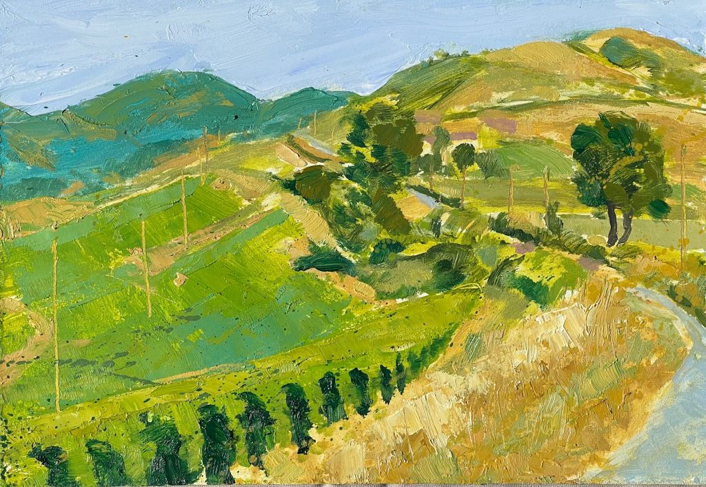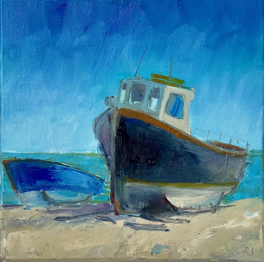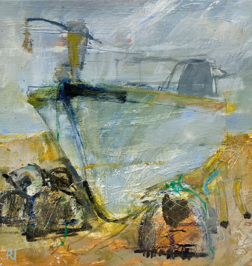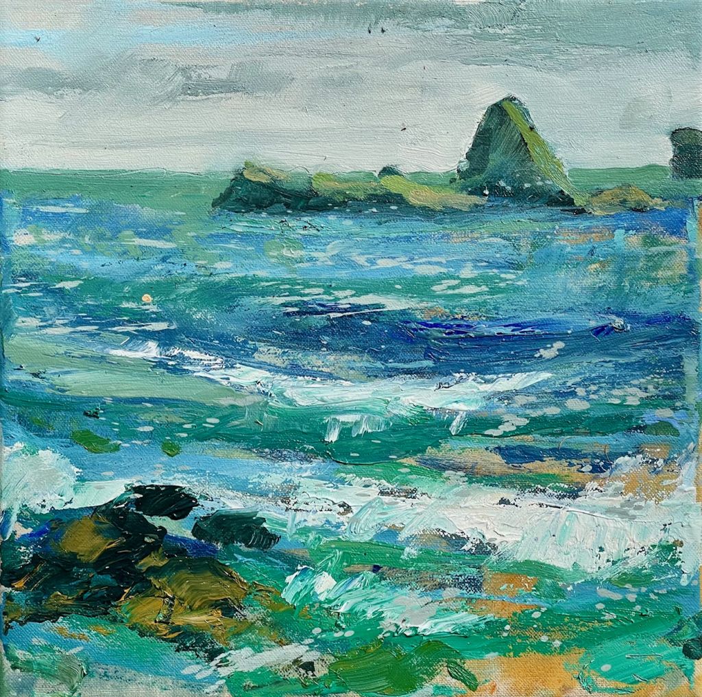 My last painting on Tiree for 2023. A grey wet unpromising day, it being my last on the island, I needed to make it count. Went up to Vaul, an astoundingly beautiful place with ancient ruined black houses showing off their remarkable masonry. A gorgeous bay. hinting at its brilliant colours hiding under the grey rain, a rusting seed drill warranting a closer look. Lazy Atlantic swell crumping onto the rocks. Corncrakes rasping on the machair.