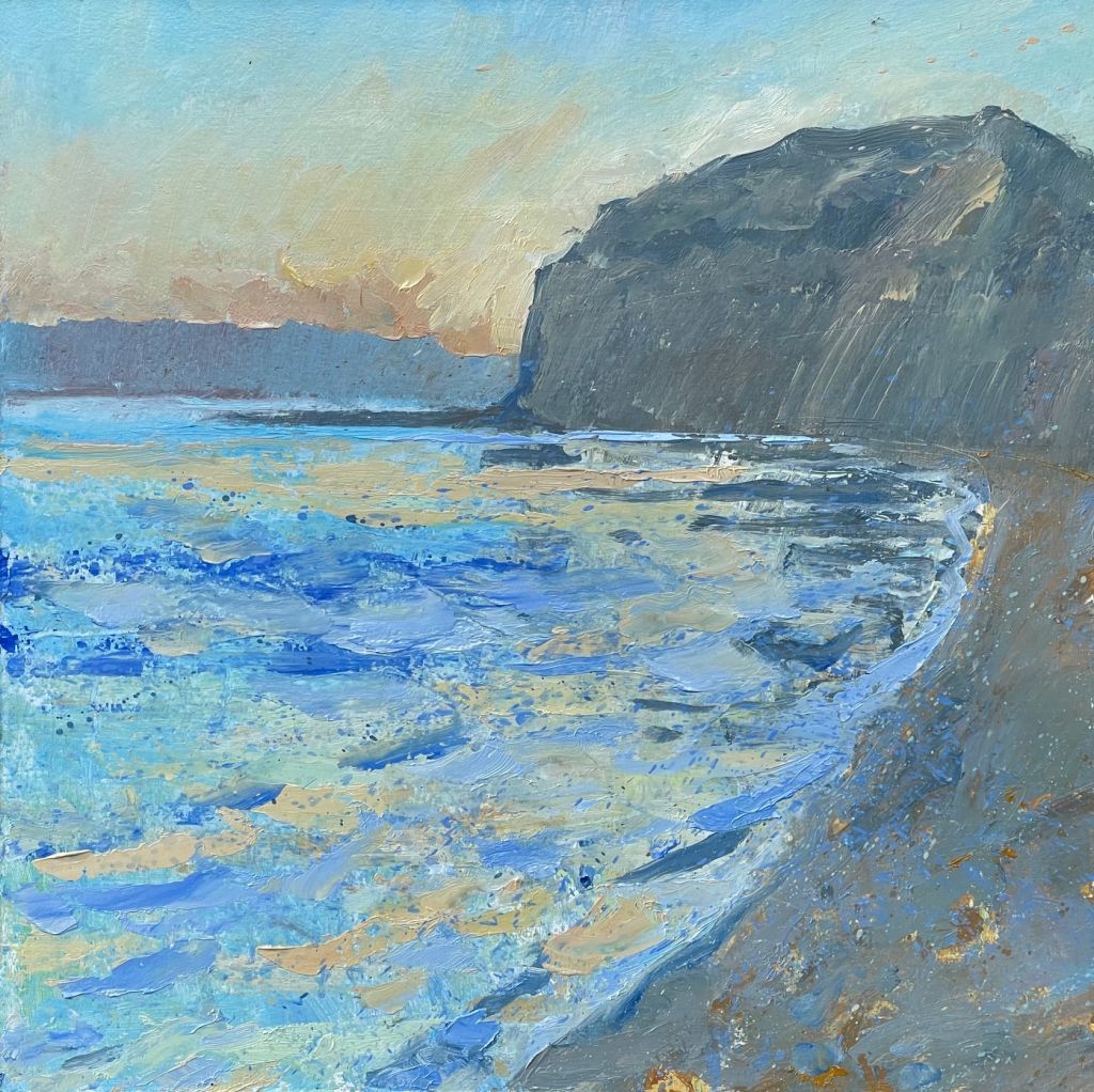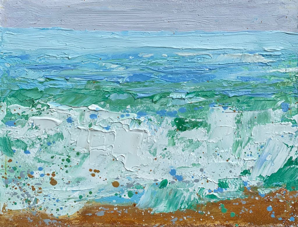 Surf crashing in with the Outer Hebrides ghosting over the horizon in the evening light. Seen in its frame, available framed or unframed. On view at Milton Gallery.