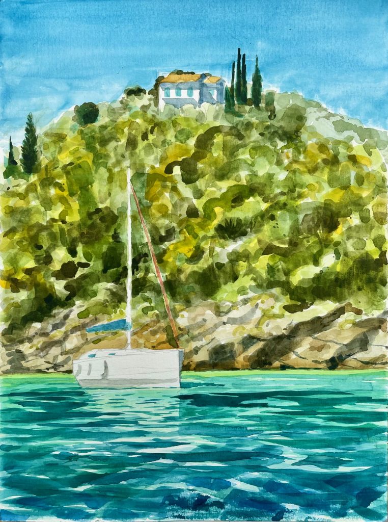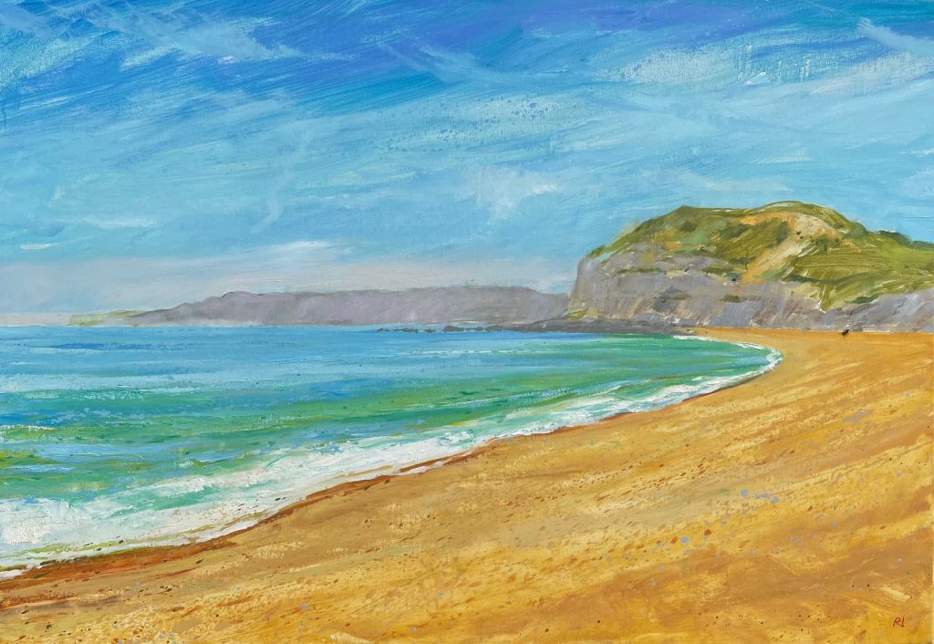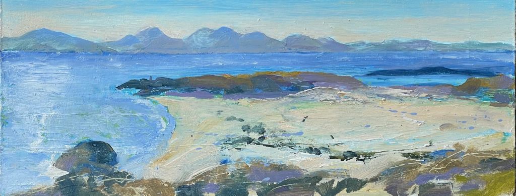 This painting goes some way to explaining my love of the West Coast of Scotland. Clouds scudding across the sky, their shadows racing across the hills, deep blue sea in the Sound of Jura, light emerald shades of the sunlit sandy shallows. Sparkling white surf on the rocks and beach. And a brisk Northerly keeping the midges away.