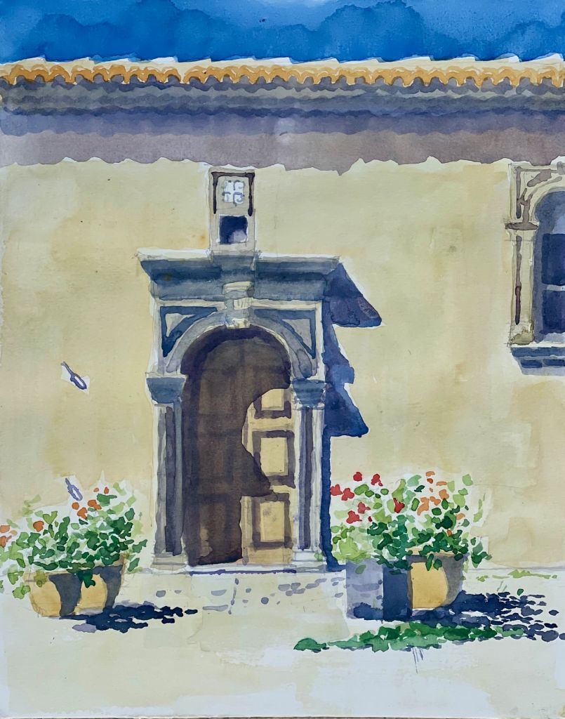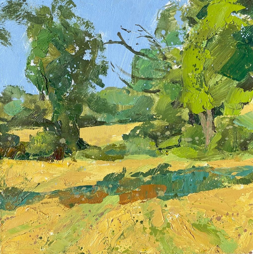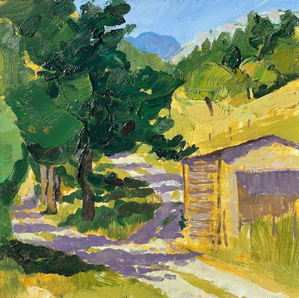 Oil on linen, 30 x 30 cm. Painted in May 2020 during Lockdown 1. A rarity of the family being together in one place for an extended period. Painting with Lily in the garden. Treasure in my memory.