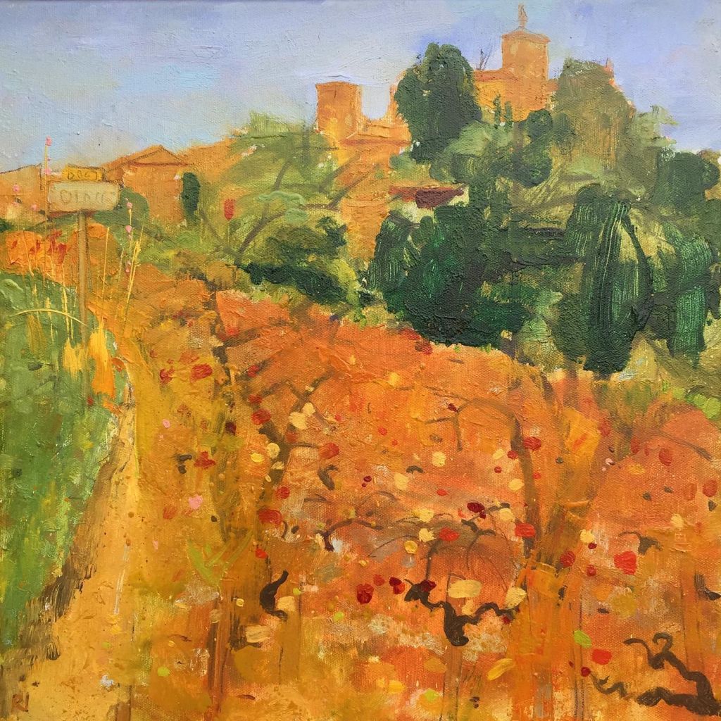 Oingt, built on its hill top has one tower left from it’s citadel which pairs up with the church, perched on the edge of its rocky outcrop. You can climb to the top for panoramic views and also explore its bottle dungeon, which forms part of the communal gallery space where I have exhibited in the past. This is painting is loaded with memories for me. You can see traces of an earlier painting, one of my very rare abandoned paintings on account of the cold. I had to stop after losing feeling in my hands and feet due to a windchill of about -25 and I didn’t have the right clothes on. Then the painting on the surface was painted from the lane leading to Ste Paule, a tough ascent on a bike and home to some excellent winemakers. The foreground is an abandoned vineyard, always quite a sad sight but visually rich with the old vines and wild flowers taking it back to nature. Louise gave à beautiful recital in the church on the outcrop and we have passed some memorable moments in the ancient honey coloured stone houses that line the lanes that lead up to the top. Oil on canvas 40x40cm Really quite happy if no one to buys this one.