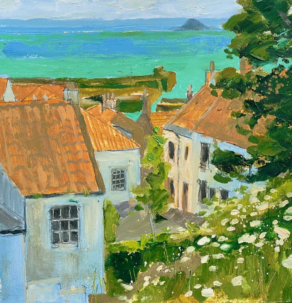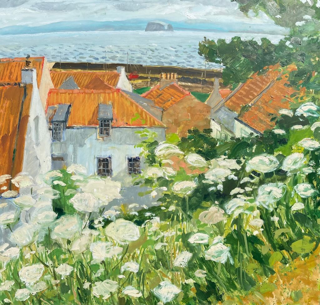 Dodging showers, looking through the cow parsley and across the pan tiled roofs, over the harbour and the Forth to the Bass Rock and East Lothian.
