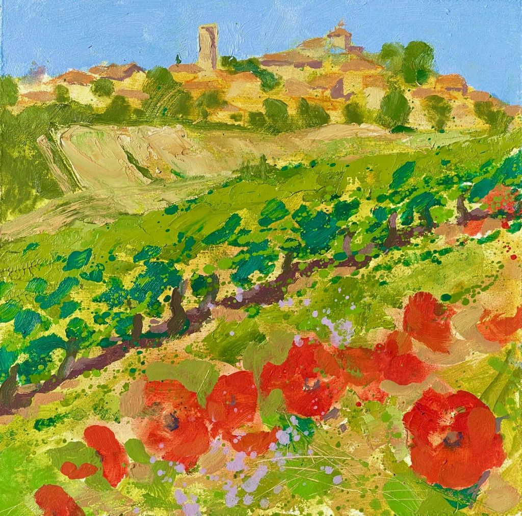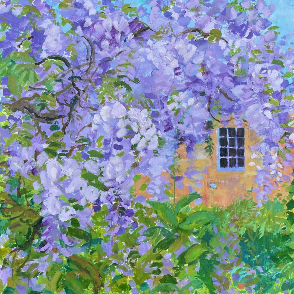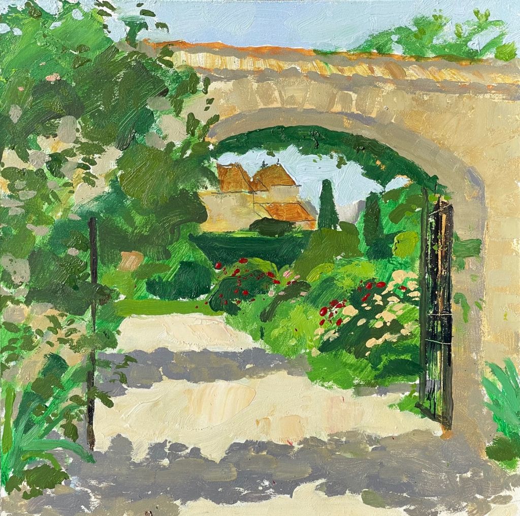 Oil on linen, 30 x 30 cm. Painted in May 2020 during Lockdown 1. A rarity of the family being together in one place for an extended period. Painting with Lily in the garden. Treasure in my memory.